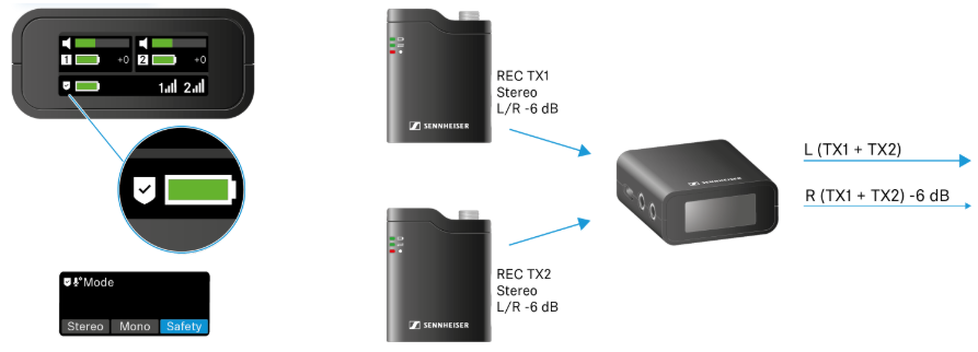 Der Safety-Modus funktioniert im Wesentlichen wie der Mono-Modus, jedoch wird in diesem Fall der rechte Kanal des gemischten Audiosignals mit -6 dB am Empfängerausgang ausgegeben. Diese leisere Spur ist eine Sicherheitsfunktion, falls der Ton während der Aufnahme an der Kamera übersteuert.