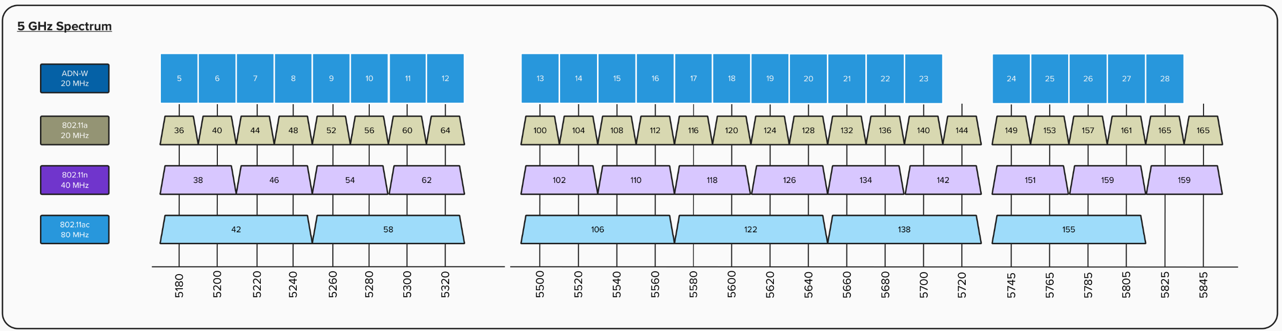 Das ADN-W-System arbeitet im 2,4-GHz- und 5-GHz-Spektrum. Obwohl es im gleichen Spektrum wie WiFi arbeitet, nutzt es nicht die traditionelle WiFi-Technologie für die Verbindung.