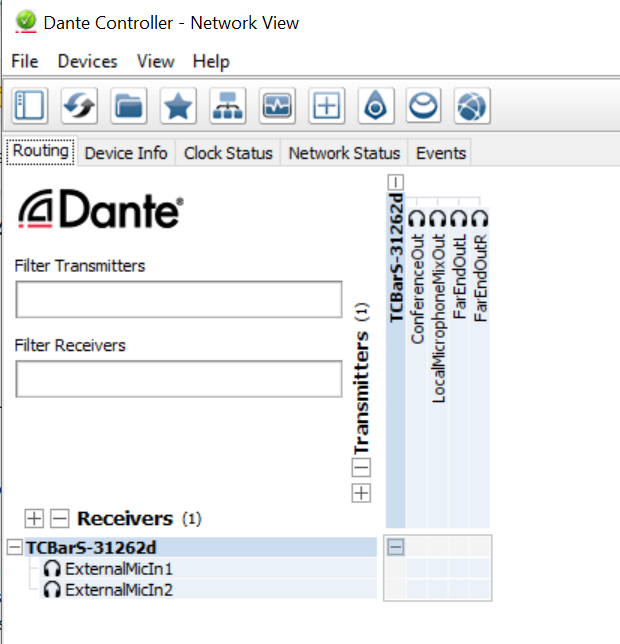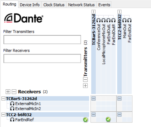 Split Mode (nur TC Bar M) - zwei getrennte Netzwerke; Dante ist physisch von der Steuerungsfunktionalität isoliert, indem beide Ports in zwei Netzwerke genutzt werden.