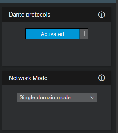 Für die Verwendung mit Dante sollte die Option Dante-Protokolle im Control Cockpit > Netzwerk-Tab aktiviert sein. Es gibt auch einige Netzwerkmodi in Bezug auf die aktuelle/beabsichtigte Konnektivität.