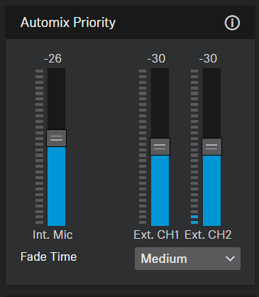 Alle Mikrofone, die an die externen Mikrofoneingänge der TC Bar geroutet werden, können mit den Automix-Prioritätsreglern priorisiert und bei Bedarf (basierend auf der Prioritätsstufe) ausgeglichen werden: