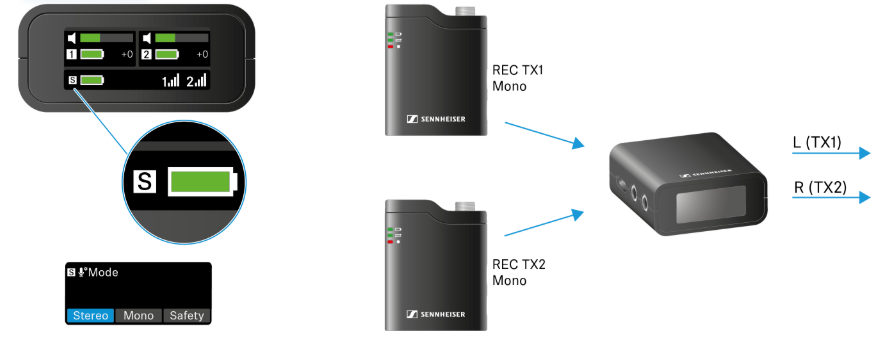 In stereo mode, the audio signals from the two transmitters are output separately via the audio outputs (analog and digital) on the receiver (TX 1 left / TX 2 right). In this mode, the audio from the two transmitters are recorded on your camera, smart device or computer as separate tracks and can be edited individually in post-production.