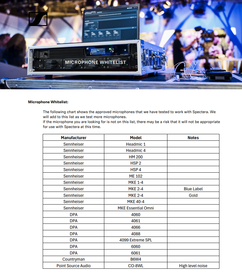 Spectera Microphone Whitelist January 30, 2026 20:28 Updated Related to RF Wireless Spectera Wireless Microphone Wireless IEM Related articles Where can I buy Sennheiser Products Where can I download Firmware, User Manuals and Spec sheets? Dante Media Encryption FAQ: TC Bar - Troubleshooting Operating distance of the EW-D and EW-DX systems.