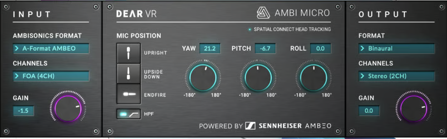 Les signaux provenant des quatre capsules du microphone Ambisonics constituent le format A, avec lequel nous ne travaillerons pas pendant le processus de mixage et de transmission. Le format A se compose des quatre signaux enregistrés provenant des quatre capsules. Pour pouvoir travailler avec le fichier audio, nous utilisons dearVR AMBI MICRO pour les transférer au format de travail, qui s'appelle le format B. De plus, dearVR AMBI MICRO propose un filtre de correction Ambisonics améliorant la précision spatiale lorsqu'il est utilisé avec le Sennheiser AMBEO VR Mic.