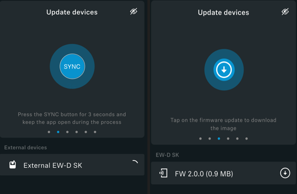 次の画面では、送信機などの外部デバイスのファームウェアを更新できます。更新するには、「Search upgradeable devices」の横にある + アイコンをタップしてください。円形のアイコンが回転し始め、アプリが更新可能な外部デバイスを探していることを示します。更新を開始するには、更新したいデバイスの同期ボタンを長押ししてください。アプリがデバイスを検出し、ファームウェアの更新が必要かどうかを知らせます。