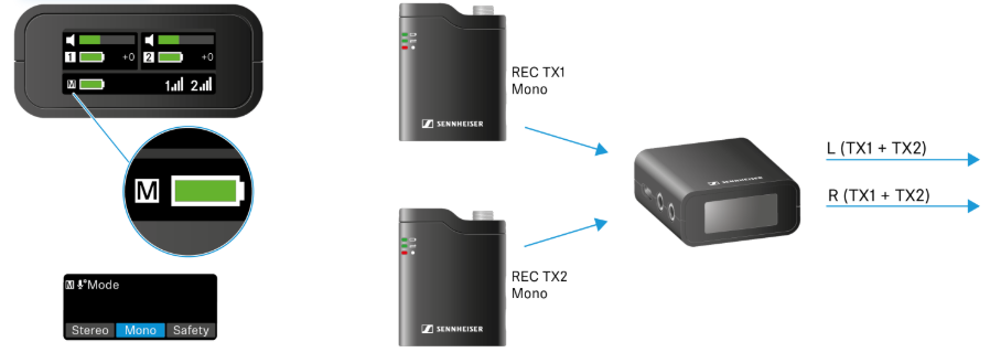 モノモードは、1つの入力チャンネルのみをサポートするデバイス(例:カメラやスマートフォン)でバランスオーディオ出力(左/右)を使用する場合に理想的です。このモードでは、両方の送信機の信号がレシーバー内でミックスされ、左および右のレシーバー出力から同一の信号として出力されます。ただし、これにより送信機からのオーディオ信号をポストプロダクションで個別に処理することはできません。