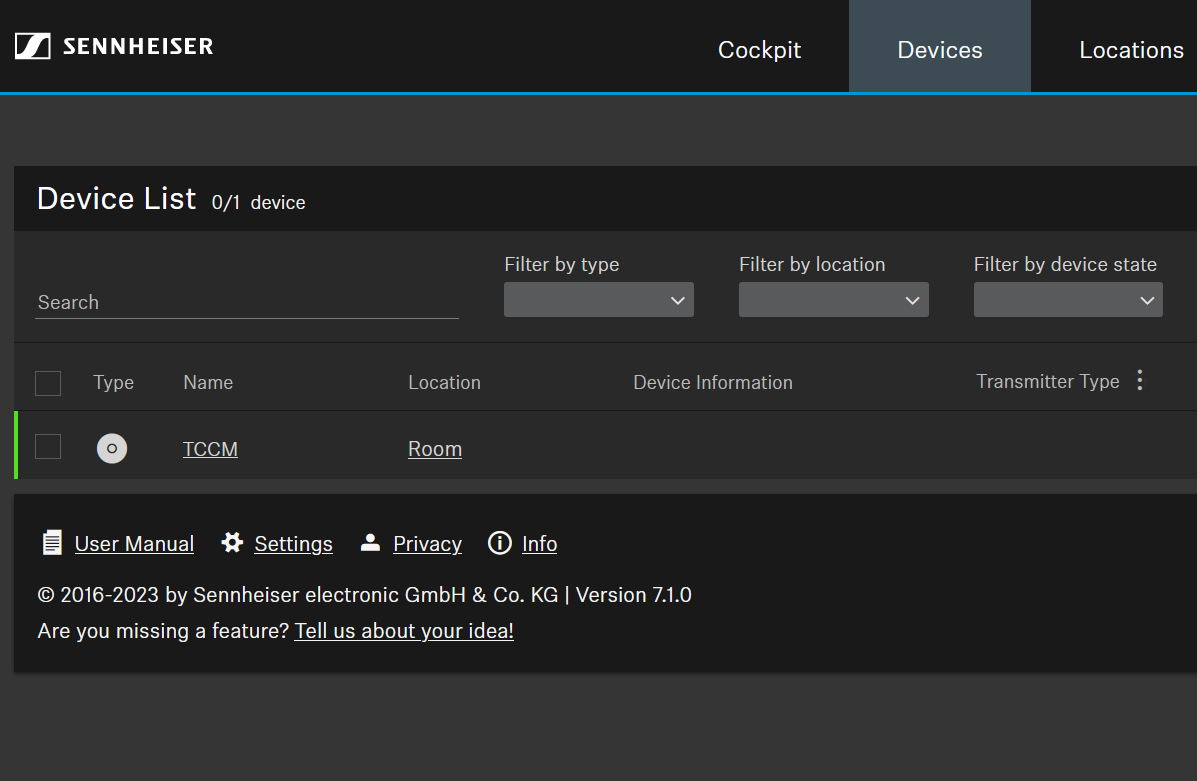1. Sennheiser Control Cockpitを初めて起動すると、TCC Mがシリアル番号とともに青いデバイスをクレームボタンとともに表示されます。