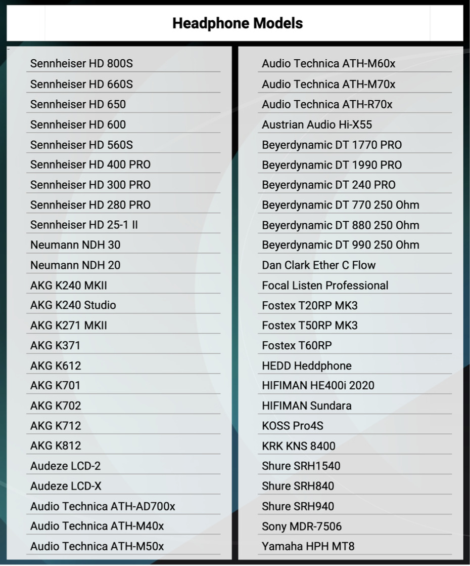 当然,耳机的质量很重要。因为它是应用监控链中的一个基本部分。这就是为什么我们只关注全球知名的录音室耳机,以便为我们的空间耳机补偿列表提供支持。即使使用先进的空间音频技术,我们也无法将廉价和劣质的耳机转变为参考级混音室。