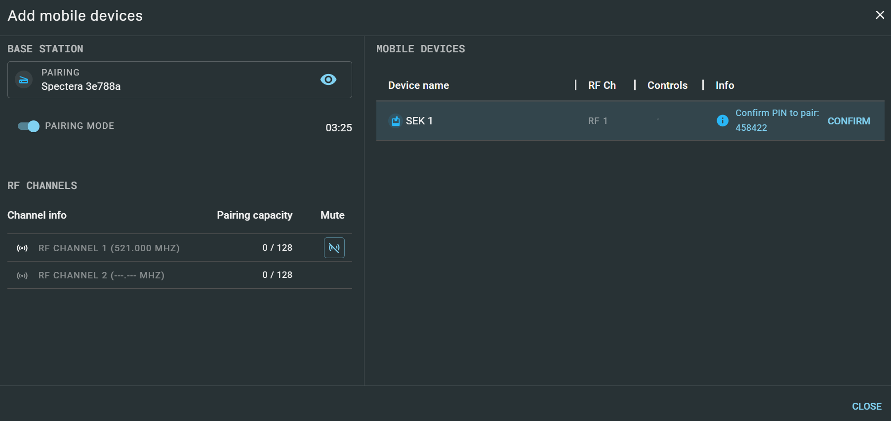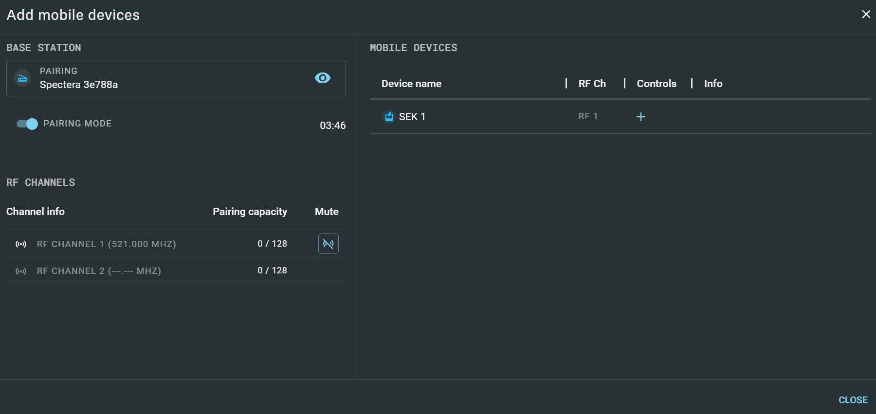 - 此时您的 SEK 已与基站配对,您现在可以设置音频链接模式。继续关闭配对模式,您现在可以关闭添加移动设备对话框。